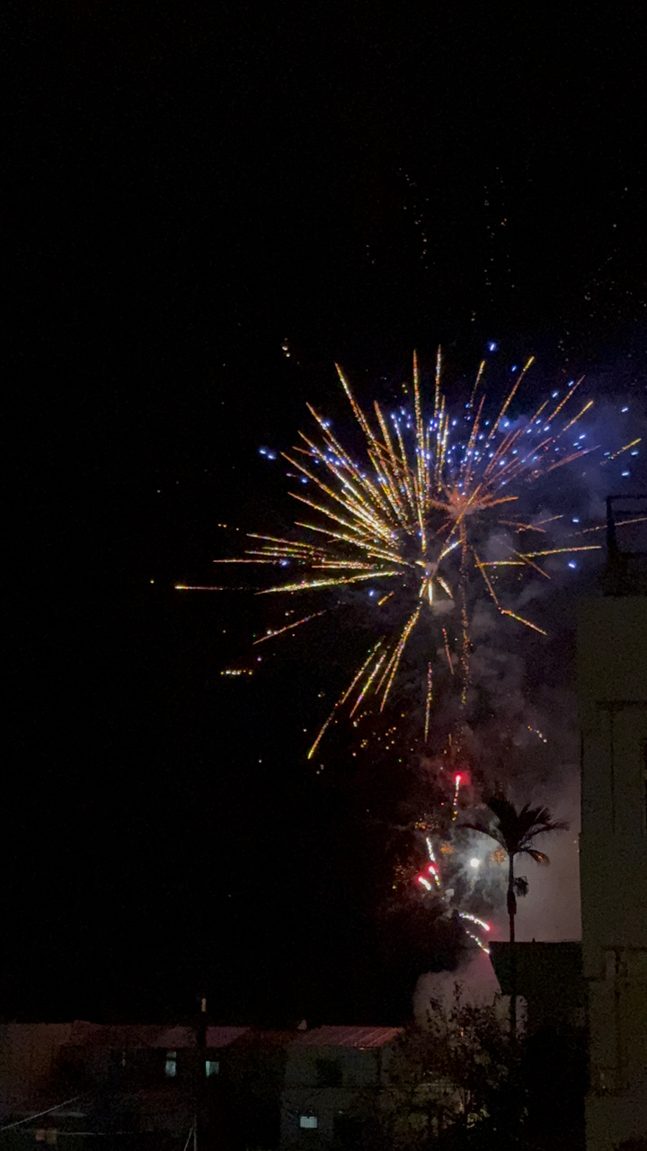 除了依山傍海,因為我家地勢較高,又是三樓半的透天厝,走上自家樓頂,不僅遠眺太平洋,整個村落也盡收眼底。每年的除夕午夜十二點,家家戶戶都會點燃鞭炮,現代更多人會買絢爛的煙火施放,所以不知道從哪一年開始,我們都會跑上頂樓等待「跨年」。因為視野遼闊,享有難得的全景視角。當時鐘指針指向12,此起彼落的煙火瞬間在眼前炸開,拿起手機想要紀錄,卻一時不知從何拍起。